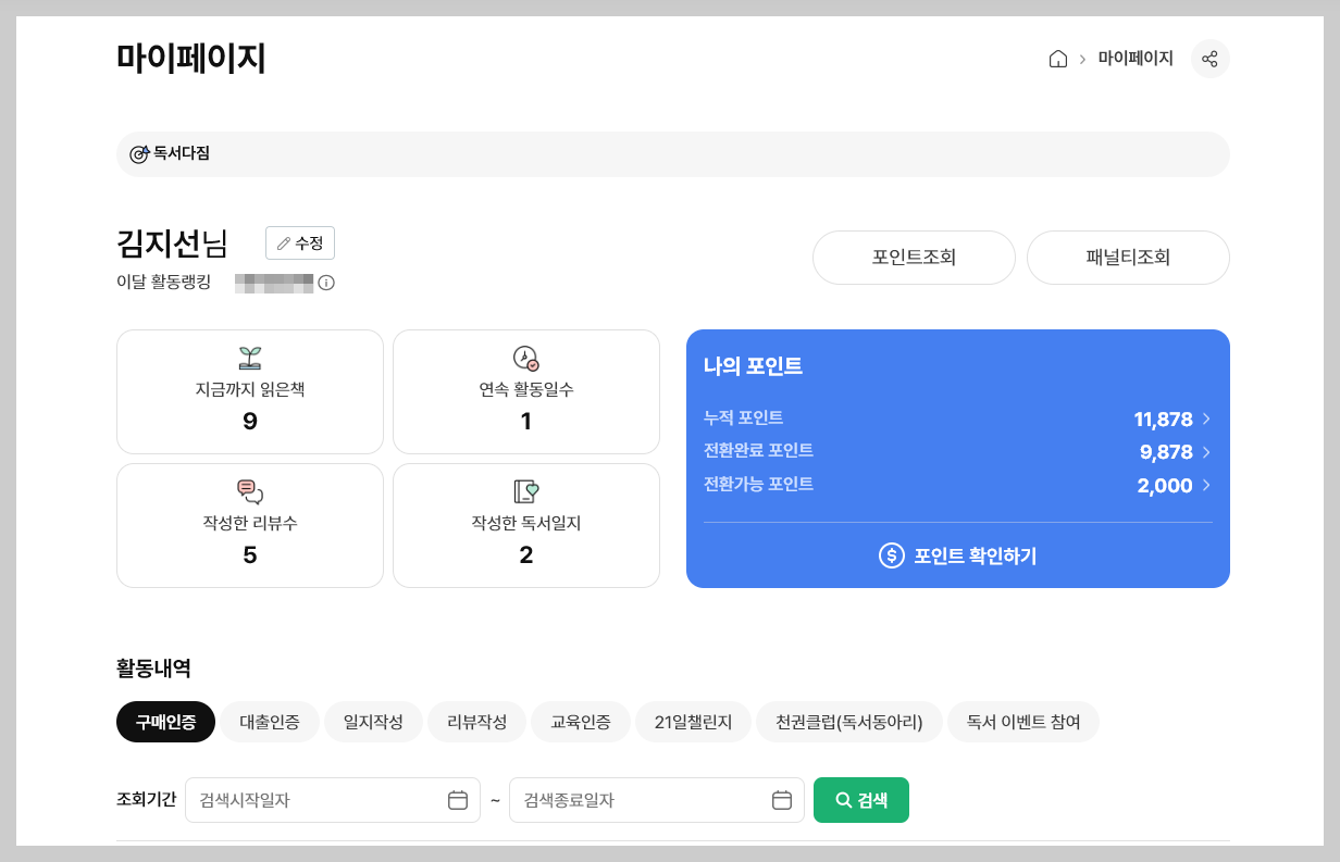 - 도서 구매, 대출, 독서일지, 리뷰, 이벤트 참여 등