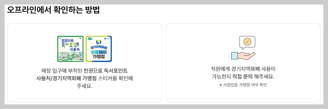 가맹점은 경기도 내 지역서점 중 지역화폐 가맹점 + ‘서점’ 업종으로 등록된 매장이어야 해요. 매장 입구에 ‘독서포인트 사용처’ 스티커가 붙어 있으니 꼭 확인해 주세요! 또는 직접 직원에게 “지역화폐 사용 가능한가요?”라고 물어보는 것도 안전한 방법이에요.