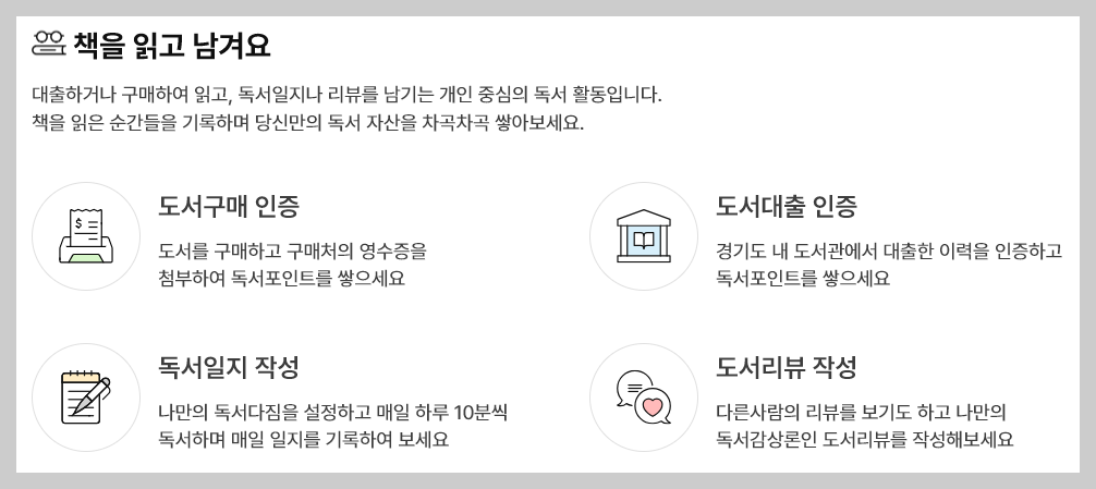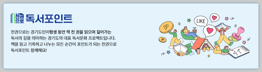 책을 읽고 → 기록하고 → 포인트 받고 → 책을 다시 사는 이보다 더 알찬 독서 루틴이 있을까요? 지금 바로 독서포인트제 회원가입하시고, 오늘 읽은 책부터 포인트로 바꿔보세요! 경기도민이라면 이 기회를 놓치지 마세요.