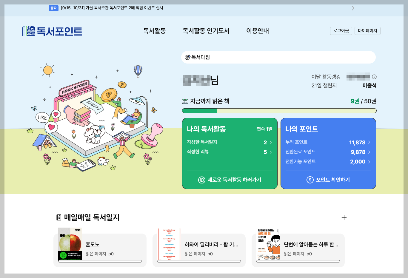 | 독서일지 | 100P | 10,150P (100회) | 200자 이상 일지 작성 |