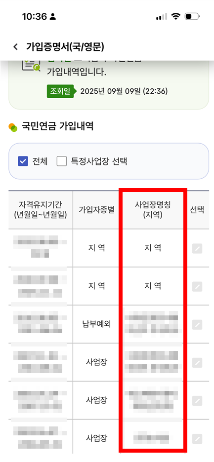 ✅ <내 곁에 국민연금> 앱 : 로그인 → 메뉴 → 증명서 발급 → 가입증명서 → 가입내역 목록에서 지역인지, 사업장인지 확인
