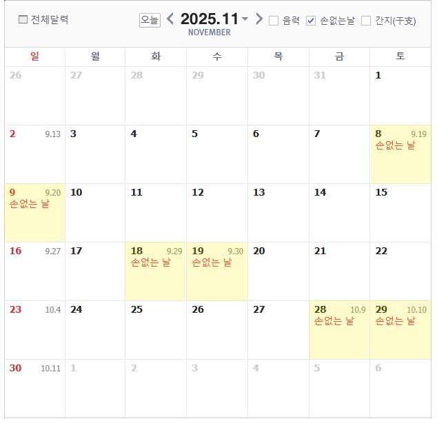 🗓️ 11월 손없는날 달력