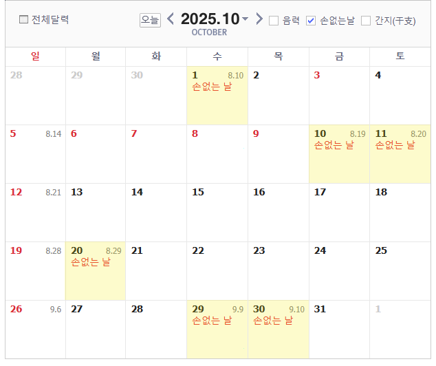 🗓️ 10월 손없는날 달력