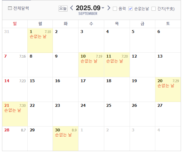 2. 2025년 가을 손없는날 달력